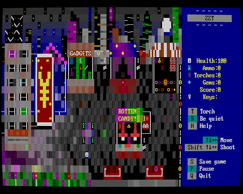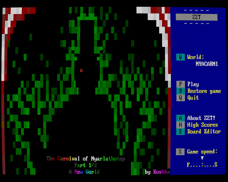The Carnival of Nyarlathotep is a multi-file epic that pushes the revered 1991 ZZT engine to its very limits. Taking place in a lush cosmos, the Maculaverse, inspired by everything from the works of H.P. Lovecraft, to folklore from all over the world, to 90s popular culture of all sorts, to theoretical physics, and beyond.